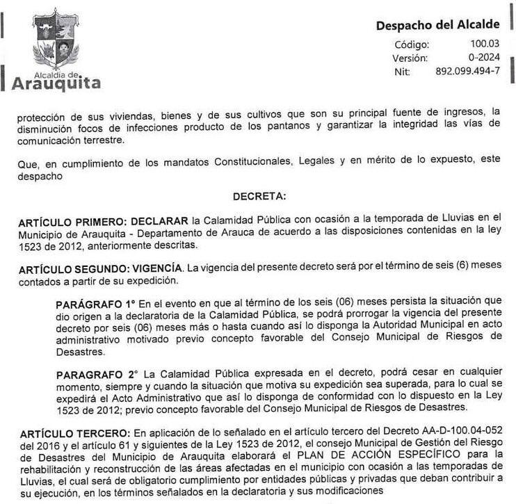 La Alcaldía de Arauquita, mediante el Decreto No. 100.08-035 del 16 de junio de 2025, ha declarado la situación de Calamidad Pública en todo el municipio. Esta medida se toma en respuesta a la grave emergencia generada por la actual temporada de lluvias y el consecuente desbordamiento del río Arauca.